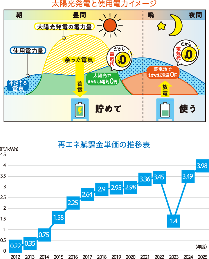 自宅の太陽光で発電した電気を使い、電力会社から購入している電力量を減らすことで、電気代の削減につながります。近年、単価が上昇している再エネ賦課金(推移画像)についても、使用電力量に応じて課金されているため、電気代と一緒に費用を削減することができます。さらに蓄電池を導入すると、昼間の電気を貯めて夜使うことで、より効率的に電気使用量を削減することができます。
